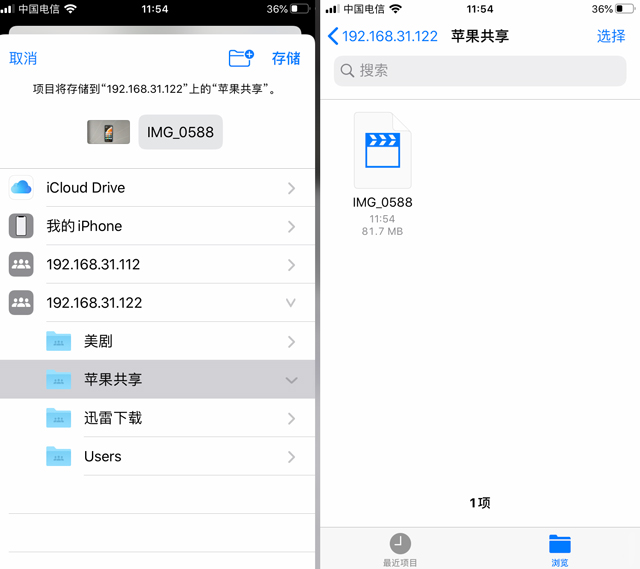 然后在文件选项中,找到刚才连接的电脑IP地址(192.168.31.122),再选择弹出的“苹果共享”文件夹,点击右上角的“存储”。稍等片刻,传输的照片或者视频,就会出现在“文件”APP的“苹果共享”文件夹中。