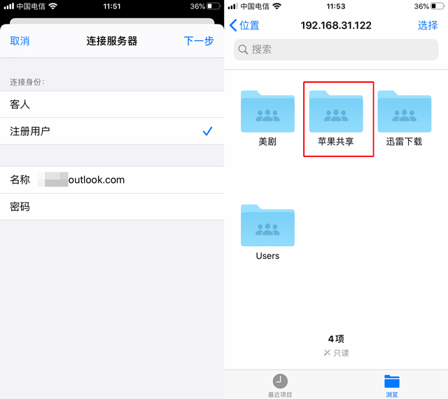 接着在下个界面中选择“注册用户”,并填入电脑所有者的登录名和密码。正常情况下就会在下一个界面中看到此前在电脑端设置的“苹果共享”文件夹了。