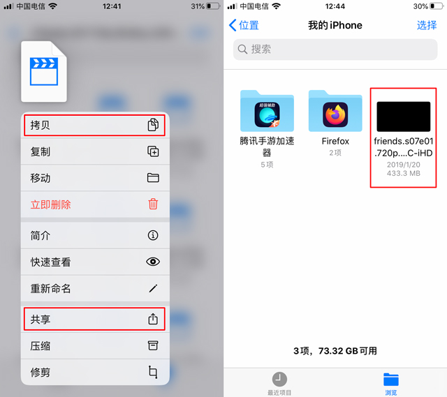 通过iOS 13系统自带的“文件”APP,也可将电脑端的电视剧或者电影传输到iPhone手机里。只需要将电脑的视频文件保存到“苹果共享”文件夹中,然后用手机“文件”APP访问“苹果文件夹”,再将视频文件拷贝-粘贴到“文件”APP里“我的iPhone”中即可。如果是照片也可以直接选择“共享”到手机的相册当中。
