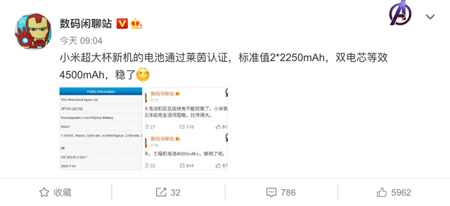 今天(8月4日),知名博主“数码闲聊站”也曝光了“小米10超大杯”的几个关键参数。据悉这款手机的电池容量将2*2250mAh,也就是由两块电芯组成的4500mAh电池。这种双电芯的设计在行业内并不常见,它最大优点是可以同时使用两个电荷泵进行充电,并通过串联将输入的电压一分为二,同时保持电流的强度。