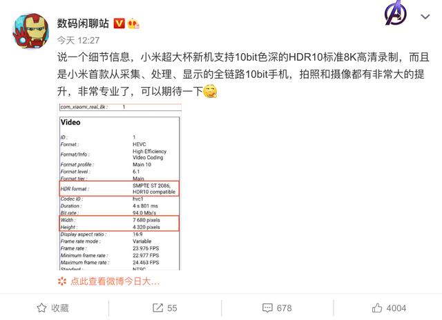 “数码闲聊站”同时爆料:“小米10超大杯”新机支持10bit色深的HDR10标准8K高清录制,而且小米10是小米首款从采集、处理、显示的全链路10bit手机,拍照和摄像都有非常大的提升。