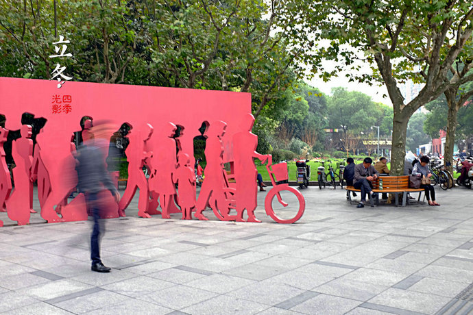 从住处经一站地铁、南京西路出口,小雨霏霏里雕塑冲击着视野。