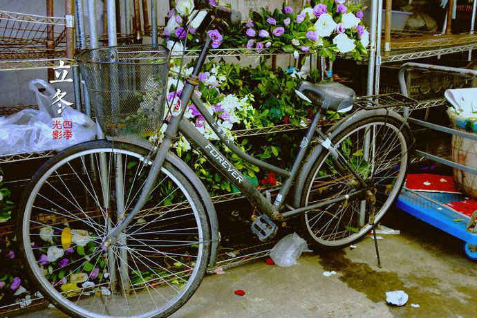 弄堂里花店外随放的一个自行车,是不是最美自行车啊,这么多紫色、白色的花儿相伴。刚好一些杂物,反而增添了地气,哈哈
