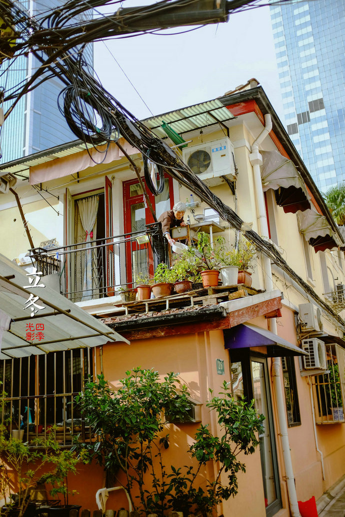 二楼的阿婆给绿植浇水,好有生活的画面。尤其喜欢这时墙壁上的一点阳光色和一楼小树的层次感。