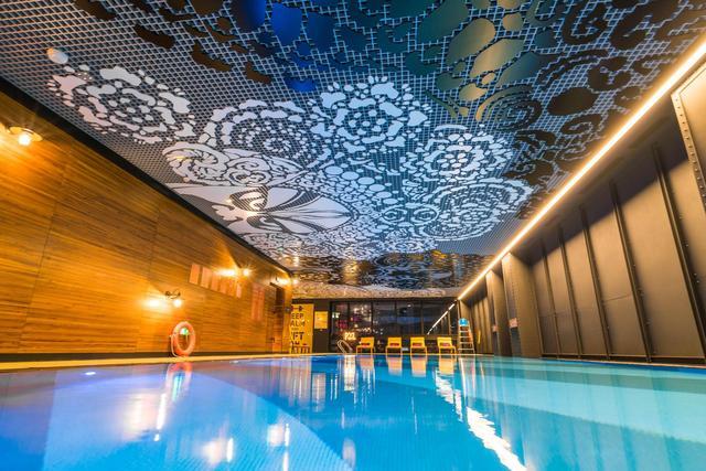 就算是简单的泳池,都能玩出不一样的花样来,进入泳池乍一看没有什么新奇,可是抬头一看,就被房顶的马赛克构成的画面而吸引,仔细一看,果然,又是越剧元素,这种发现不一样的感觉,还蛮让人有成就感的。