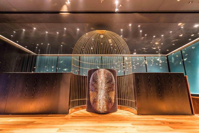 下面这个是三层包厢外面的装饰,同款风格鸟笼,有着密集铆钉的像脸谱的摆件,很酷炫哦。