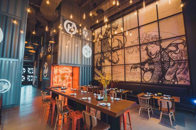 而十六楼的日料餐厅千場,风格则完全不像一个日式餐厅,别说居酒屋那样的小吧台,榻榻米等东西,跟日式搭边的元素也不多,high高的挑层,现代感的灯饰,工业风的设计,霓虹的灯饰,跟日式餐厅结合在一起,却完全不显得违和。