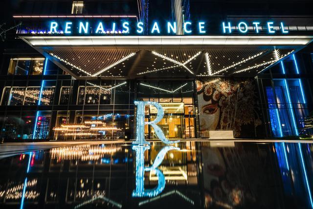 刚到酒店外面就有被吸引到,一个小型的无边界水池中间,万丽酒店的标志屹立其上,水中的倒影更是彰显其个性,除了华丽的灯饰外,大门边上的半张戏曲脸谱着实吸睛,从这里我就看到了这家万丽风格的不一样。
