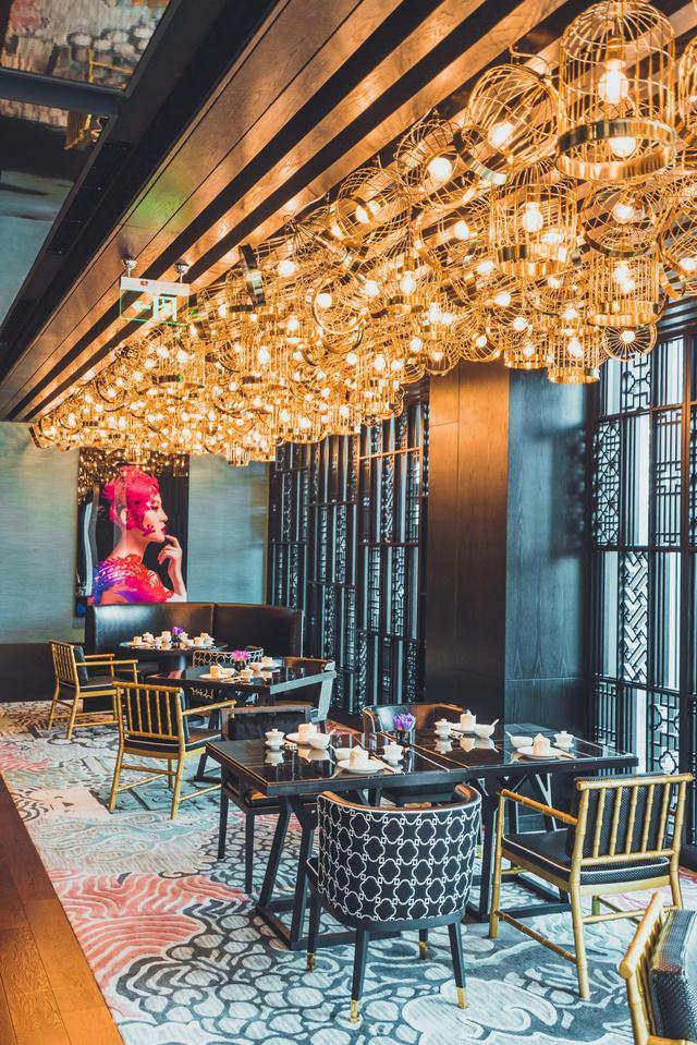 中餐厅分上下两层,一层为大厅,可同时容纳65人用餐,拥有散台和卡座;一层为包厢,以八仙过海里的八仙来命名。在这里,光与影、时尚设计与传统戏曲被无限放大,想要高级地吃一顿中餐,最适合不过。