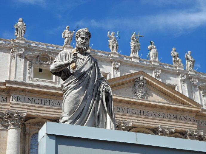 几乎每个旅游攻略上都把“登上圣彼得大教堂俯瞰罗马城”作为梵蒂冈必须体验的,到顶之后,确实所言不虚。隔着铁丝网,在离天堂最近的地方,看永恒之城,无以伦比的壮观。辛苦爬的几百级台阶算是最好的回报。穹顶下,钥匙状的圣彼得广场一直向远处延伸开去,罗马城壮丽的景色展于眼前。钥匙象征着圣彼得开启天国之门的金钥匙,是圣彼得的标识,在宗教题材的雕塑和绘画上若看见一个老头拿着钥匙,多半就是圣彼得了。