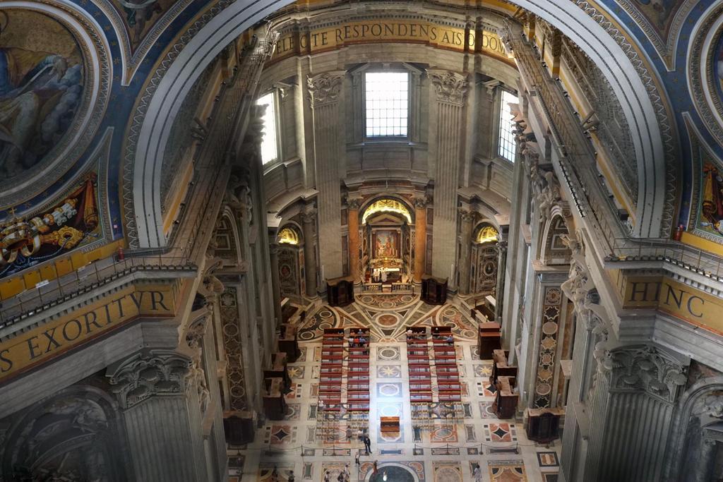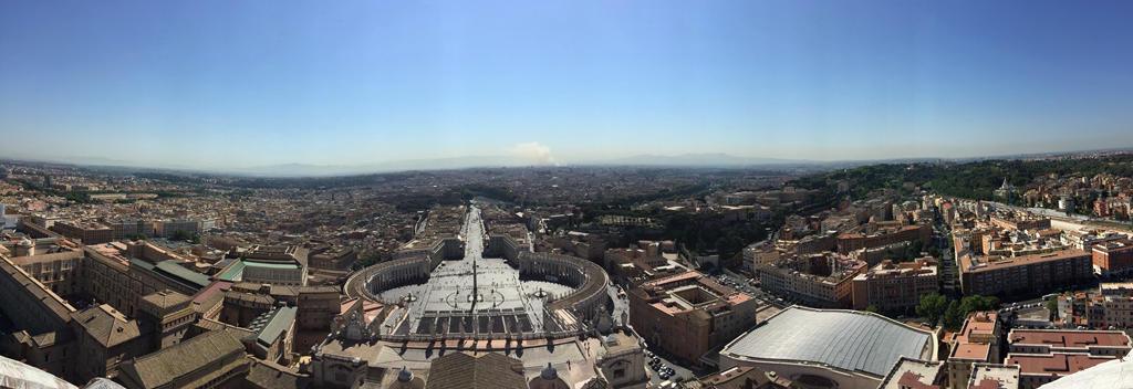 坐在圣彼得广场的台阶上吃完早点,不知道怎么就走到了教堂的侧面,然后就到了登顶的售票处。既然到这儿了,索性就先登顶再看教堂吧。事后证明这是一个明智的选择,因为出来的时候乘坐电梯的入口已经排了长队。票价分两档,爬楼梯5欧,坐电梯7欧。其实楼梯没有想象中的多,大概爬了十几分钟就到了一个平台(电梯也是到这里)。到顶尚远,需要继续向上爬,不知道转了多少圈,越向上越窄,最后通过一段异常狭窄陡峭仅能通一人的过道,这才脚踏实地。