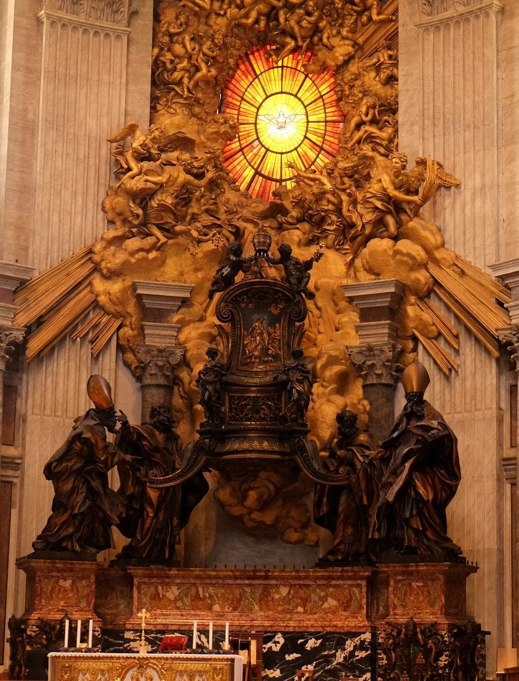 在教堂的尽头,圣彼得宝座的椅背上有两个小天使,你也可以发现她们的手中握着的也是开启天国的金钥匙。这是贝尔尼尼设计的一件镀金青铜宝座,是圣彼得大教堂不可错过的精品之一。宝座上方最引入注目的是光芒四射的圣灵鸽子,好像展开翅膀,带你飞向天堂。