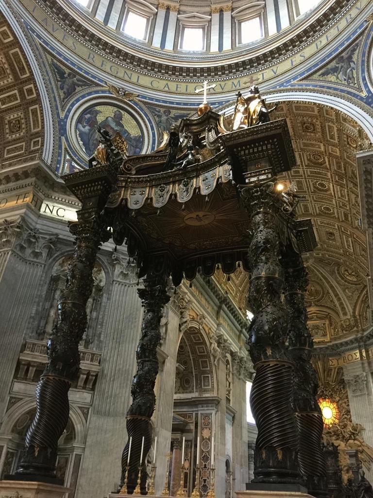 在宝座的前方,是贝尔尼尼另外一件绝世作品——青铜华盖。从中门步入大教堂,这个黑魆魆的高大“轿子”恐怕是最吸引人眼球的了,没有人会错过。四个螺旋铜柱如游龙般向上攀升,估计高度在10米左右,雕刻的粗狂又不失精细,铜柱可见镶嵌的枝叶,四角的柱头顶端是四个天使。我无法想象,贝尔尼尼是怎样完成这样恢弘的作品。他应该会有很多助手吧,我想。