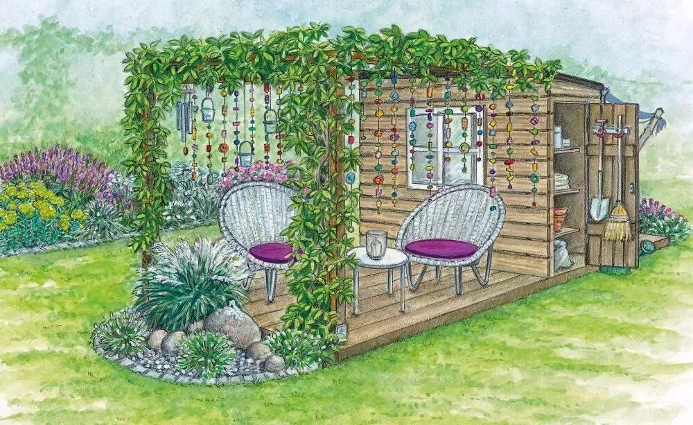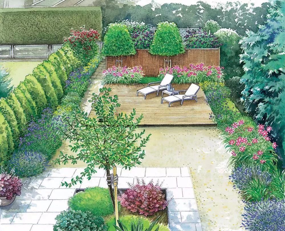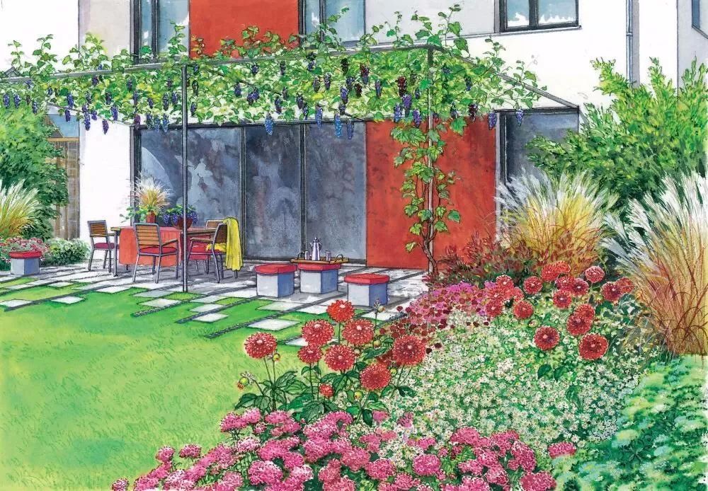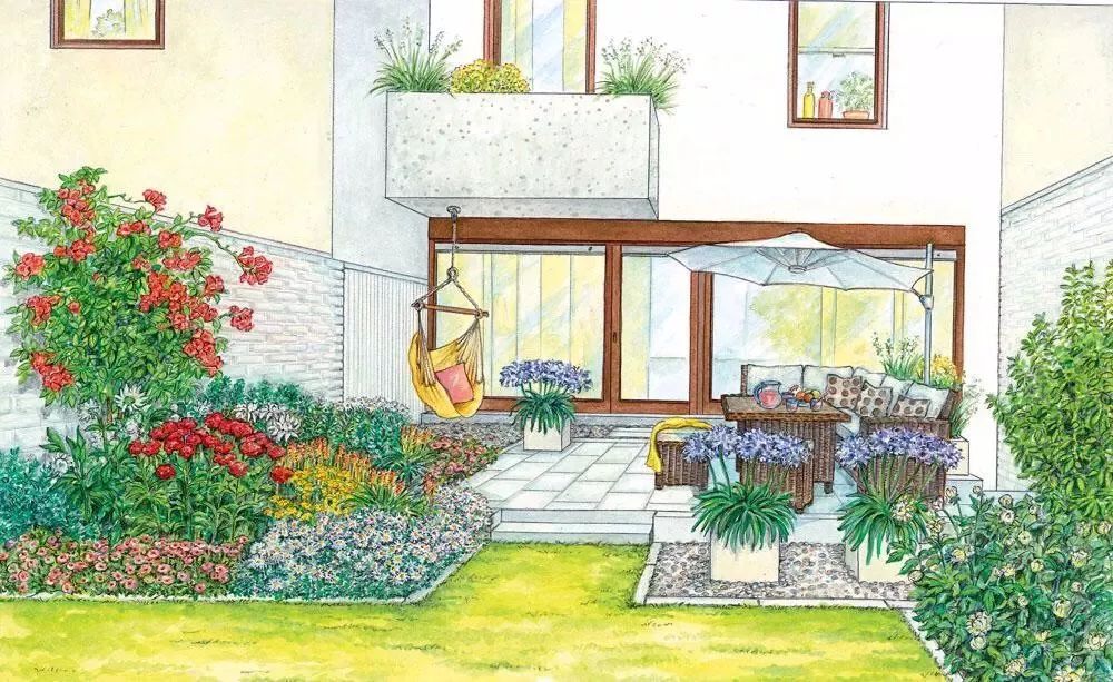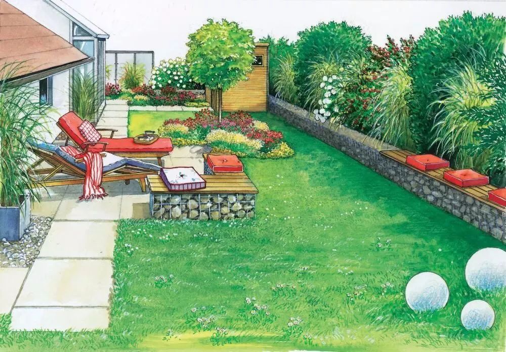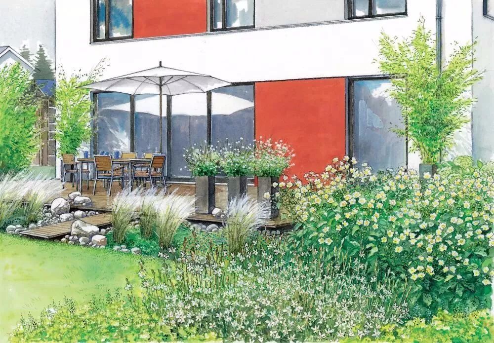 经过分析之后,你的脑袋里可能已经有了具体的想法了,不要着急实施,不妨先画一画草图,也不需要多好的画画功底,主要是为了心中有数,确定植物摆放位置和需要的量。注意这里需要预留小径,空出座椅的位置,初学时容易忽略这些空间。