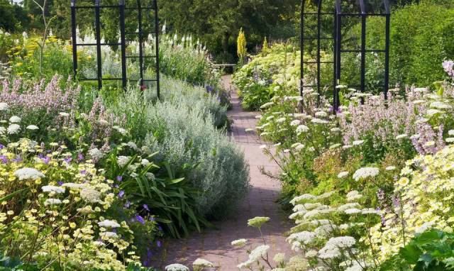在单色系设计中其实暗藏小技能,例如营造一个白色花园时,可以取用的白色有很多,奶油白、粉白、青白等,同时在叶色配置方面花点心思,引入对比鲜明的叶色、叶型和质感,有助于为花园带来张力。如叶色可以选择浅绿、中绿、深绿,也可以使用银色、灰色或者灰绿色。