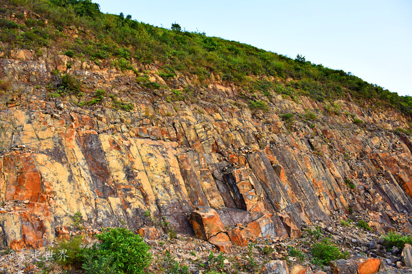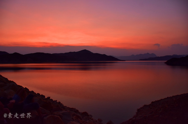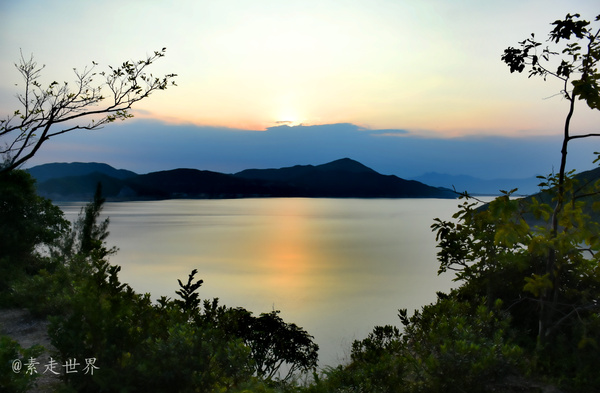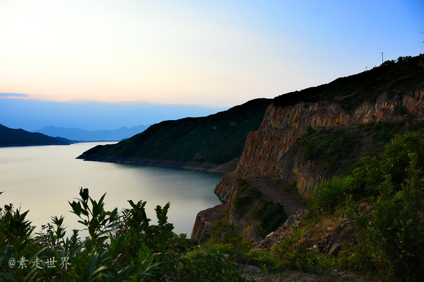 从浪茄到东壩这段路是最舒适平坦,半山的栈道也是港剧中经常出现的场景,但为了在天黑前坐到出租车离开,并没好好欣赏,只是随手拍下几张远景。在出租车站点前一公里左右也让人驻足不前,一边是亿万年遗留的流纹岩柱群,另一边在夕照下波平如镜的万宜水库静静地沐浴着余辉。身体虽然累,眼睛却不曾错过一分一毫。可喜的是,尽管离开时天色而然暗,可如绳网撒开的漫天霞彩,水天相衬,形成一幅柔美的水墨长卷。如象在庆祝我们的艰辛旅程结束一般。