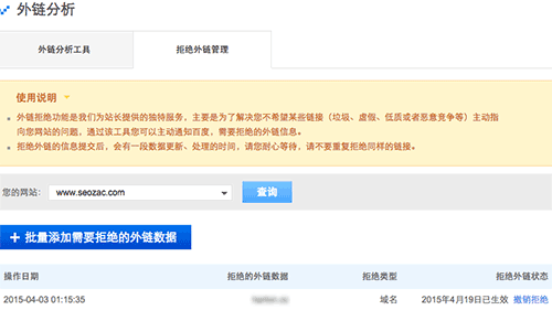 为了做实验,我当时只拒绝了一个域名的垃圾外链。4月3号提交,4月19号生效: