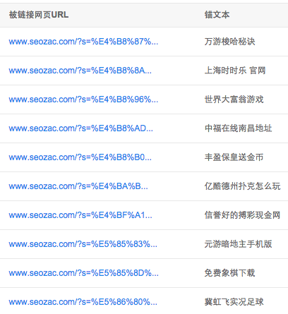 短短3个月,垃圾外链增长到近600万了。百度站长平台外链分析这次改版一个不错的地方是,外链按域名分开了。可以看到,排在第一的网站居然给了我100多万垃圾链接。点进去可以看到锚文字和目标URL: