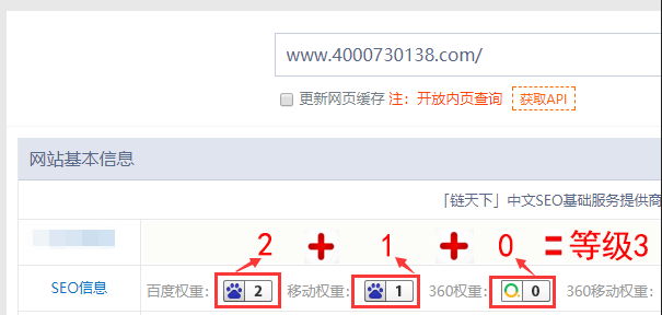 网站等级计算方法:网站等级计算方法:百度PC权重+百度移动权重+360PC权重 以站长工具(chinaz)数据为准。