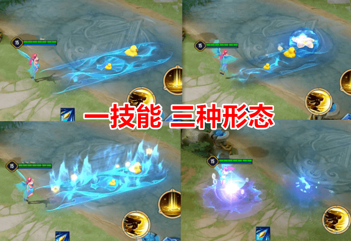 首先一技能就分为了三种形态,三种展现形式,先扔出一朵白莲花,之后小黄鸭会慢慢的游出来,最后在技能轨迹上的水会向上喷洒,非常的好看,单单一技能的设计就非常多的细节了,而二技能因为是一个位移技能,所以并没有很大刀阔斧的制作,貂蝉奋力一跃脚下激起水花,出现在另一端时则是海水托她儿出,视觉效果还是可以的。