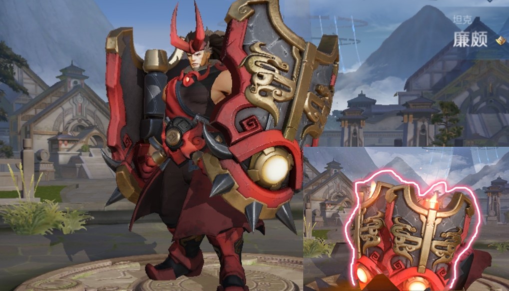 廉颇手上的两个大盾牌,有一个巧妙的机关,在战斗的时候会喷火,然后造成强大的冲击力。让廉颇凭借着这两个武器可以无限的控制对手,因为廉颇全部技能放完,可以拥有三次击飞、两次减速,控制链十足,所以改版之后也被称为“月下无限廉”。