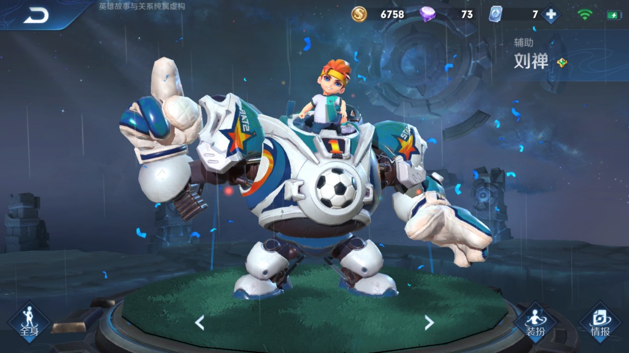 看完棒球场的,来足球场逛一逛吧。刘禅是一个纨绔的皇二世,因为喜欢足球,但是身高不够,还没有小卤蛋高,所以定制了一套装备——大机甲。这么大的机甲说开就开,可以看出刘禅家里是有钱人家啊!刘禅操作机甲这么大的体格,在足球场上一伫立,整个球门估计都要被挡上一大半吧,何愁赢不了比赛呢?