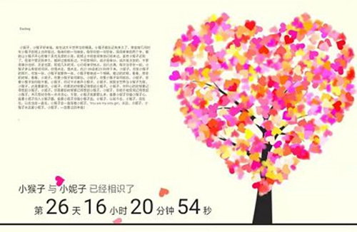 而你,也为我准备了情人节礼物,还为我用编程做了一个动画情书的APP,这真的是我收到过最浪漫最有心意的礼物了!看着你写给我的情书,其实很酸,最受不了人家给我煽情,但是,感动的泪水却湿了眼眶。你给我的不止是感动,还有心动!每隔几天,就去看一看我们的情书,因为上面实时更新着我们每一秒在一起的时间,看着时间一天天的过,希望这个时间,永远不要停止,永远不会消失。一辈子,一个世纪,小猴子你说会不会有一天,后人发现了这个APP,上面显示的相识时间,是永恒!