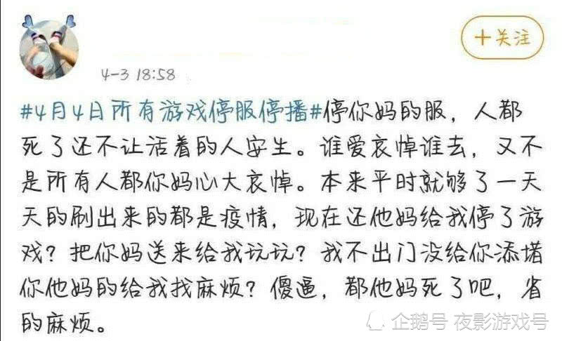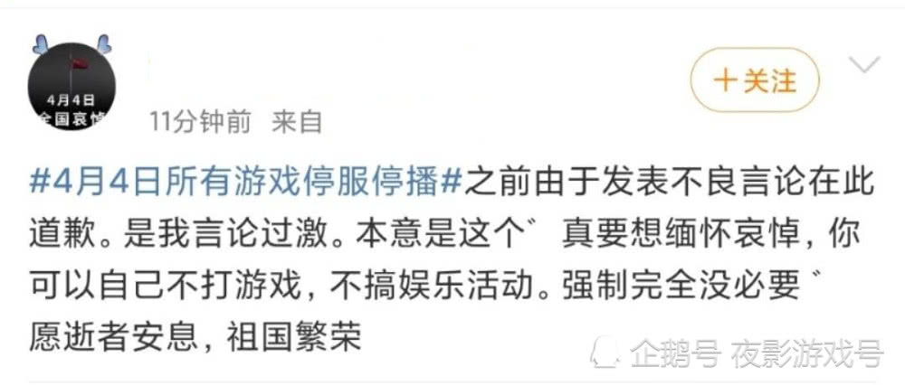同样,腾讯游戏也在4月3日晚22点宣布所有游戏正式停服一天。此条微博一出,大家议论纷纷。有的网友拍手称赞,有的网友说形式主义,有的网友哀叹明天不能享受游戏的快感了。小编想说的是,游戏只停服一天。当你若干年再回忆起游戏停服的那一天后,你也会无意间回忆起那天是要表达烈士与逝世同胞的深切哀悼。没有游戏的一天,也是能正常过的。我们不应该因为游戏停服感到愤怒和失望,游戏不该成为你生活中唯一的存在!反而我们需要致敬那些带来春天而沉眠于这个冬天的所有人