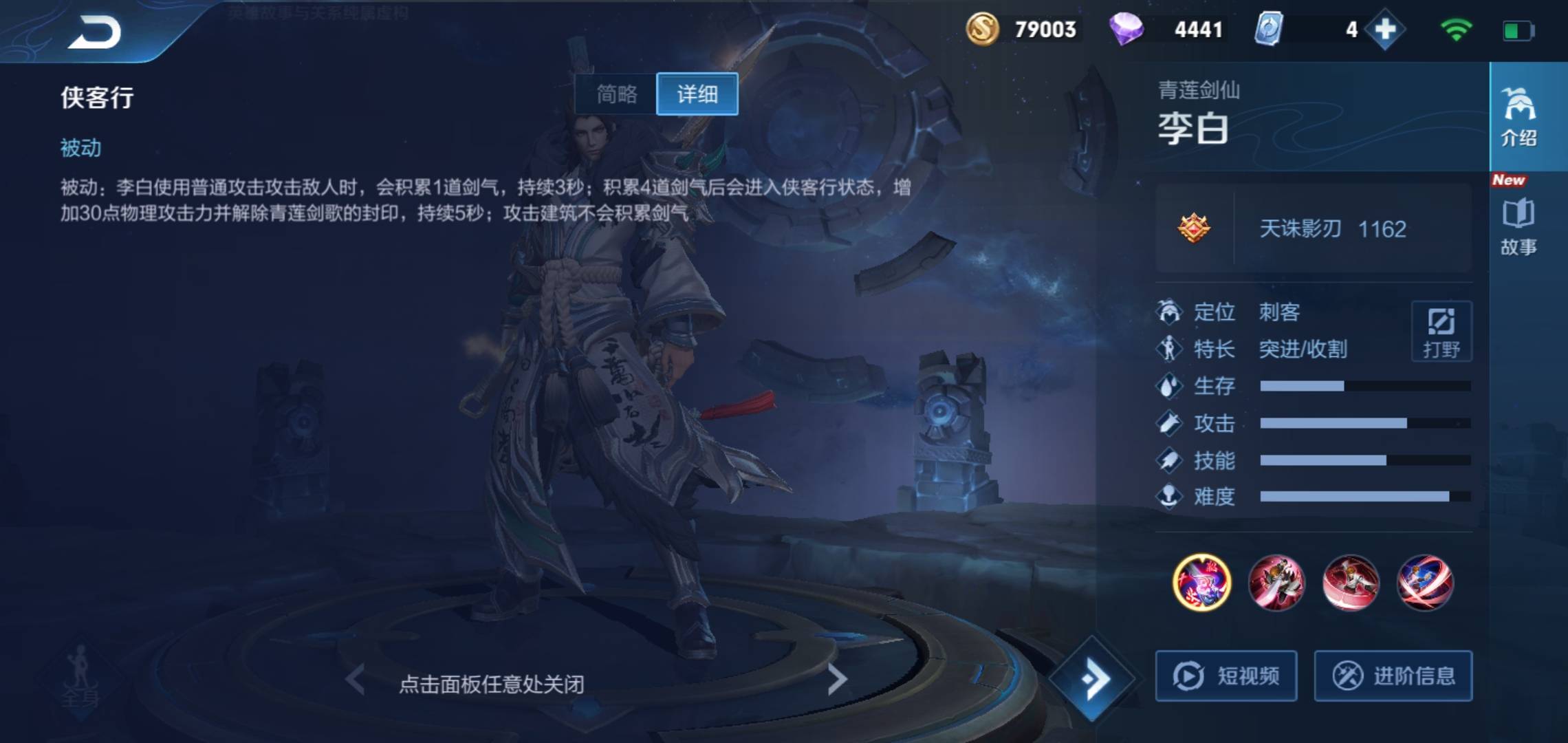 李白使用普攻时候,会积累一道剑气,积累到4道剑气后就进入到了侠客行状态,增加攻击力并且解除青莲剑歌的封印。