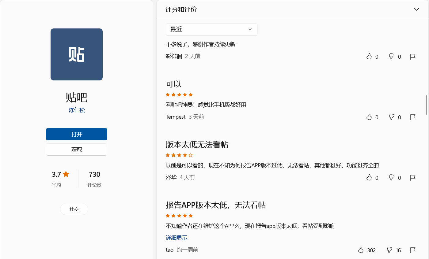 根据微软应用商店的评价系统,该应用在过去几周被网友发现无法使用了,提示 App 版本过低,无法查看帖子,近日的 9.0.0 版本更新就修复了该问题。