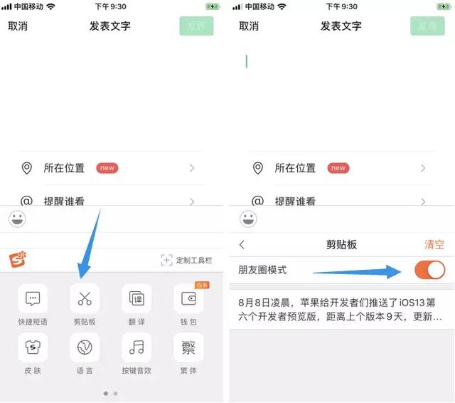 搜狗输入法:复制好要发朋友圈的文字,打开朋友圈发送页面。点击输入法左上角的图标,点击剪贴板,打开朋友圈模式,然后点击要粘贴的内容就好了。