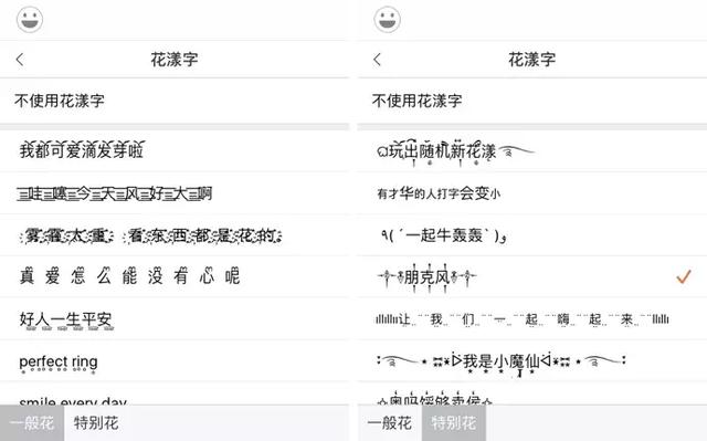搜狗的花漾字分为一般花和特别花,直接点击就可以使用了,取消花漾字效果也是一样的方法,直接点击上面的不使用花漾字即可。