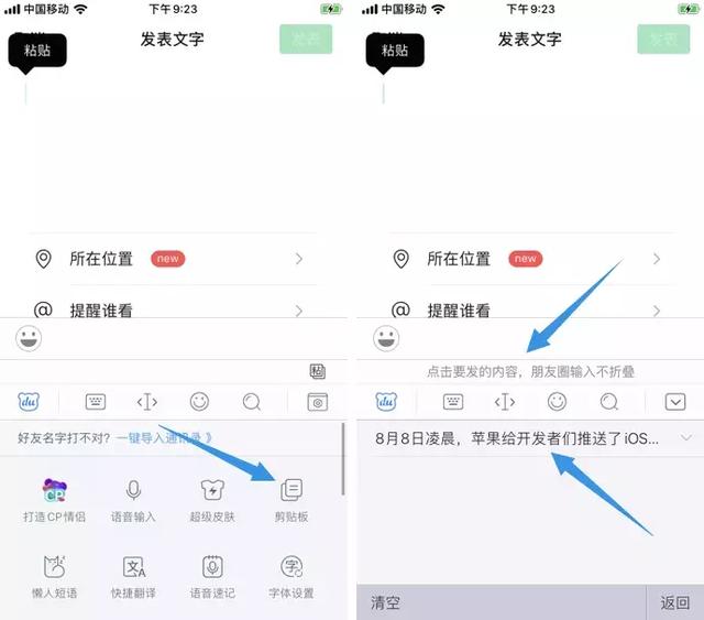 讯飞输入法:也和上面两款输入法基本一样的方法,点击剪贴板,然后打开不折叠模式,点击要发布到朋友圈的内容就可以了。
