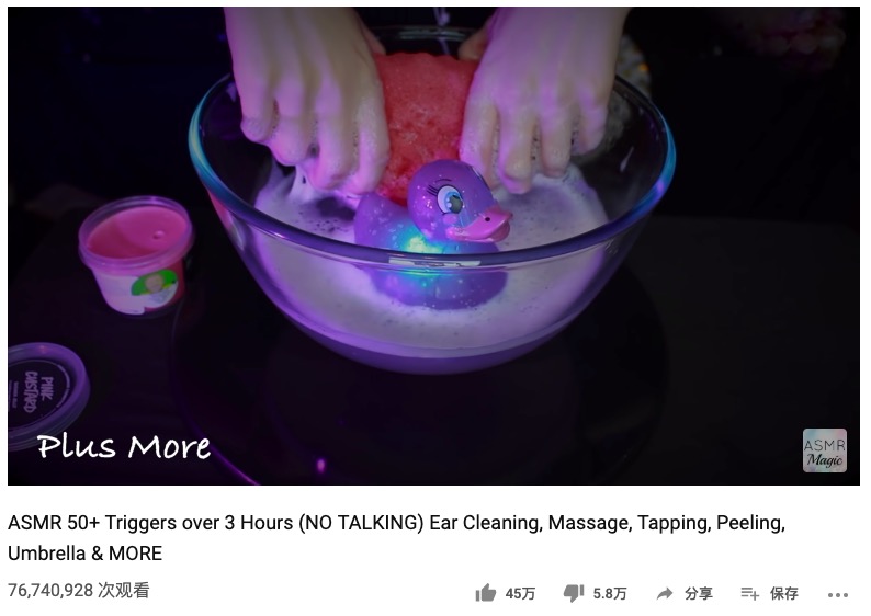 ▲ 播放量超过 7674 万的 ASMR 视频,图片来自:YouTube