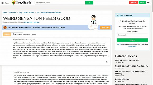 对于 ASMR 这种难以名状的感受的讨论,最早来自十年前在医学网站 SteadyHealth 的一个帖子,当时有网友在帖子中描述了自己经过的几种「奇妙而舒服的感觉」。