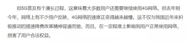 想推广5G可以,但不能牺牲4G用户的上网速度。还是那句话:既要走向5G时代,也不能忽视4G用户的上网速度需求,不能强行牺牲4G用户的利益,来满足5G网络建设的需求。