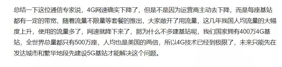对此,专家的意见是:中国4G技术已经到极限,4G基站已经到顶不能再建了,只能新建5G基站。