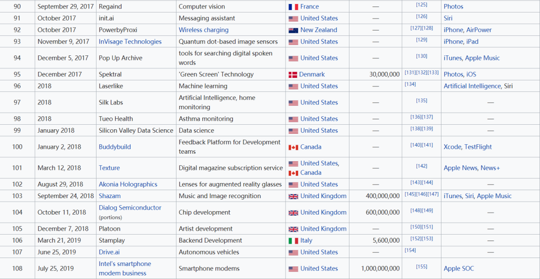 其中包括,2013年从SRI国际人工智能中心和Nuance Communications公司手中买下了语言助手Siri;2014年以约30亿美元的现金和股票收购Beats Electronics;2019年苹果公司又以10亿美元从因特尔手中购买了调制解调器芯片业务。