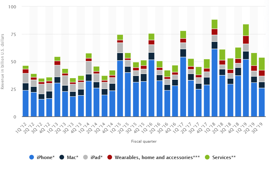 不过,iPad业务和Services业务相比,Services在statista网站的对苹果公司从2012年第一季度到2019年第三季度营收变动的结果表现上为正增长,而iPad则为负增长。