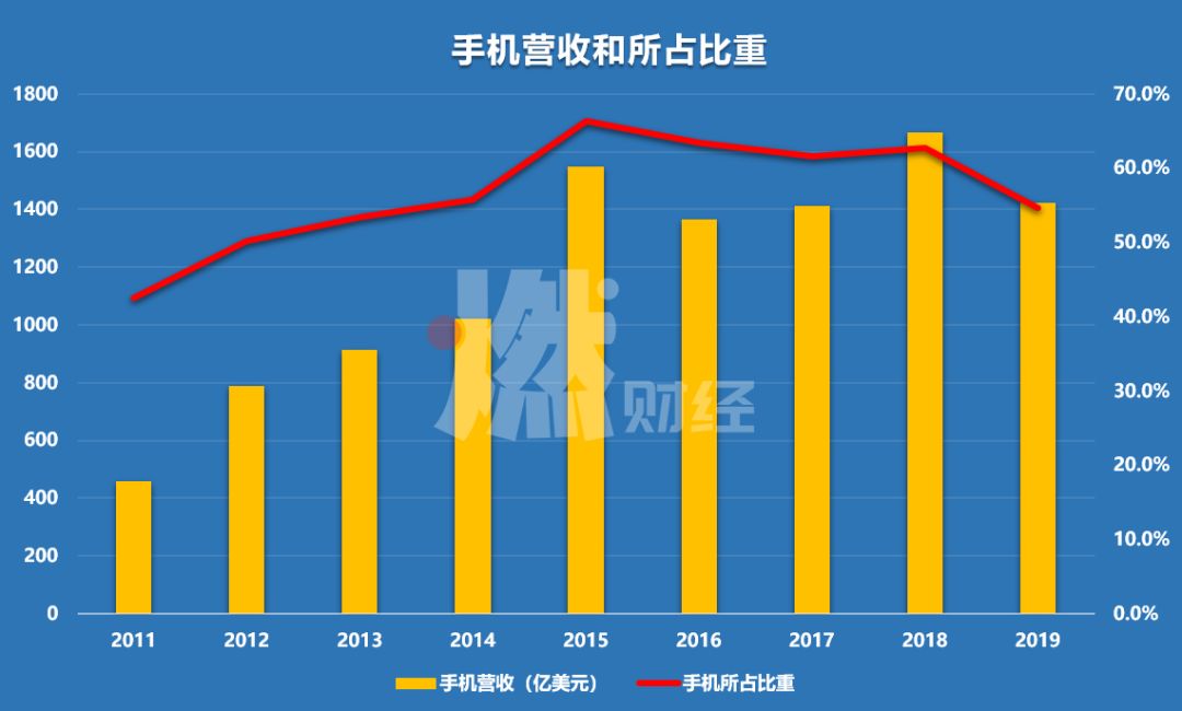 造成利润率下降的直接原因来自iPhone销售比重的下降,2019年iPhone整体营收只占苹果全年营收的54.7%,为2014年以后最低。