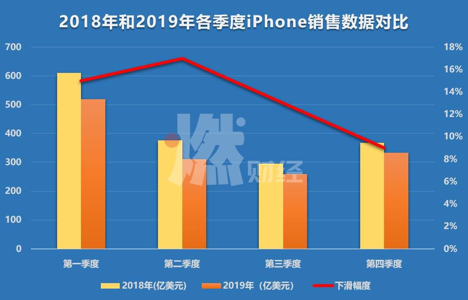 作为苹果最大的收入来源,iPhone今年的整体趋势在走弱。燃财经统计发现:2019财年Q1到Q4,苹果公司的iPhone销售额同比一直在下滑,下滑幅度分别为15%、17%、13%和9%。