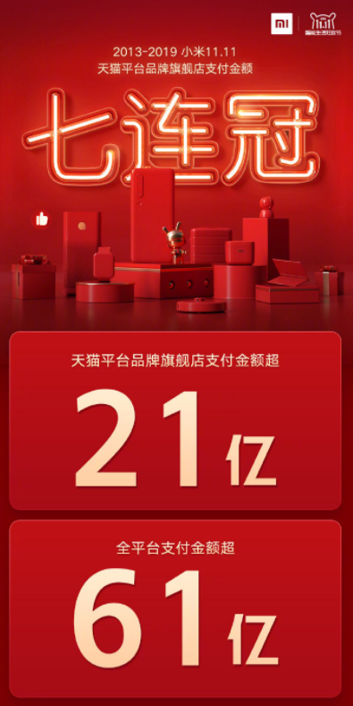 首先是小米,小米表示自己拿下了天猫“品牌旗舰店支付金额冠军”,而且是七连冠。不明白为啥小米把限定语加这么长,直接用销售额冠军不更简单明了吗?所以也不清楚小米的“支付金额”的定义,不过小米这个冠军含金量还是很高的,以具体金额呈现的冠军,比什么百分比,多少倍要强太多。