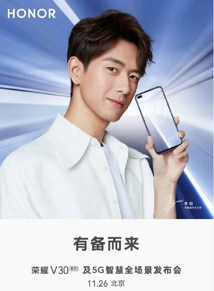 在双十一当天,荣耀赵明透露荣耀V30将会在11月26号正式发布。就在双十一过去之后,荣耀手机官方微博也正式宣布了这个消息,并且还公布了荣耀V30的两位代言人,分别是李现和黄景瑜,都是当下当红的流量明星。作为荣耀今年的“科技标杆”,首先在造势上荣耀V30就已经非常成功了。