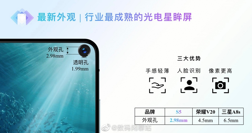 在配置上,VIVO S5并没有太多让人惊喜的地方。不过这款手机依旧有很多卖点,而最关键的点就是它的屏幕。此前也说过,VIVO S5是国内首款采用OLED打孔屏+屏幕指纹识别的手机。现在网友还给出了这款手机的打孔技术。显示其采用的是行业最成熟的光电星眸屏,外观孔的尺寸为2.98mm(目前市面上最窄的开孔),透明孔的尺寸为1.99mm。对比目前的市面上的开孔屏手机,荣耀V20的为4.5mm,三星A8s更是达到了6.5mm。