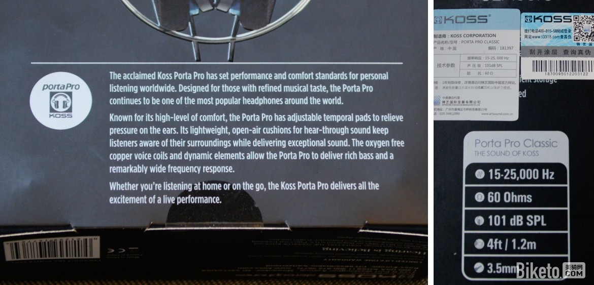 侧面和背面是一些参数和产品描述,可以看到Koss的中国总代是锦艺国际(同时也代理森海塞尔、骷髅头和Focal)。作为一款入门的随身耳机,PP的阻抗居然高达60Ω,不得不让人怀疑这玩意儿真的适合手机用吗?