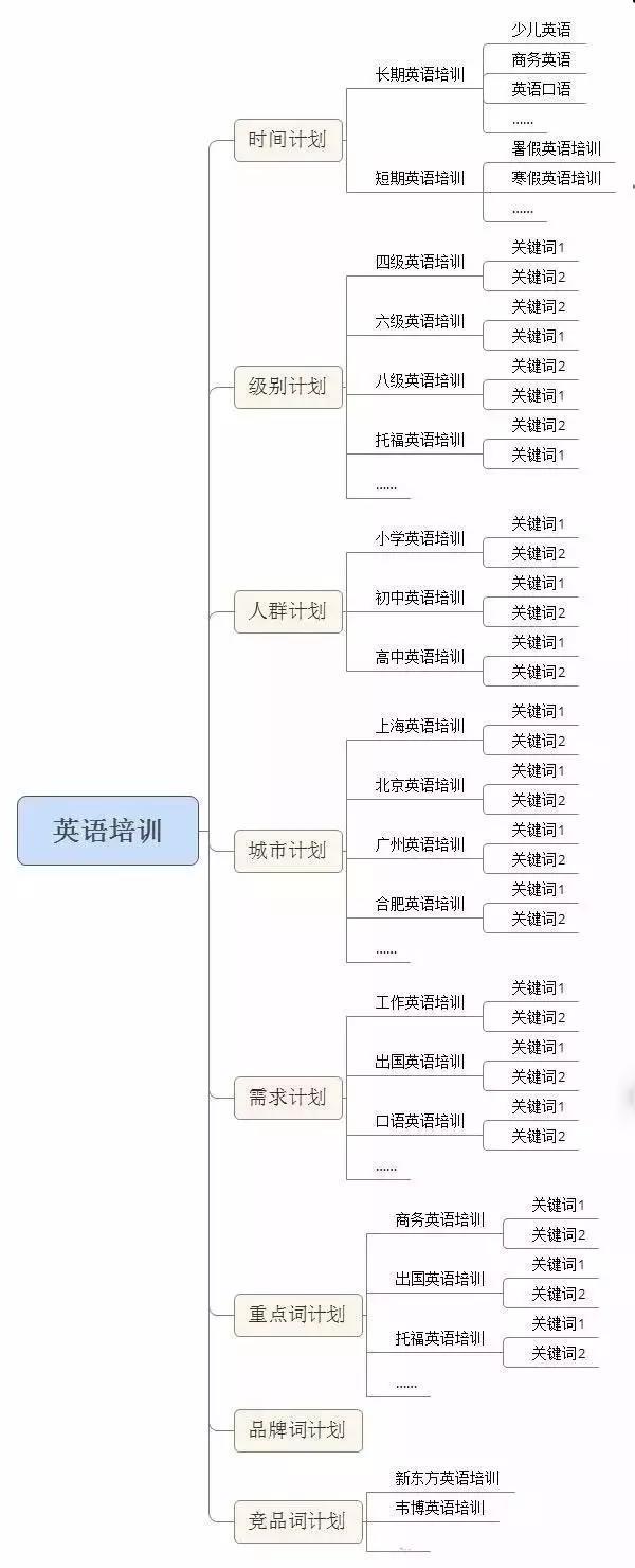 比如是做英语培训的,我们可以按照时间来分:长期培训和短期培训;按照级别来分:四级,六级,八级等;按照人群定位:小学,初中,高中;按照城市来分:上海英语培训,北京英语培训,合肥英语培训等;按照不同需求来分:入职,出国,交流等;