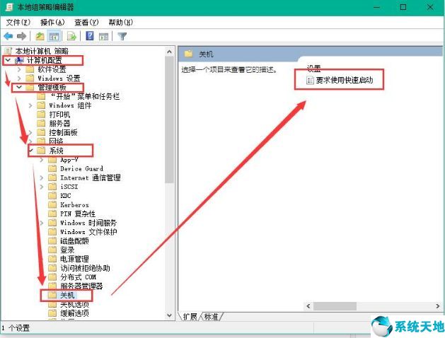 2.在“本地组策略编辑器”依次打开“计算机配置——管理模块——系统——关机”在右侧双击“要求使用快速启动”