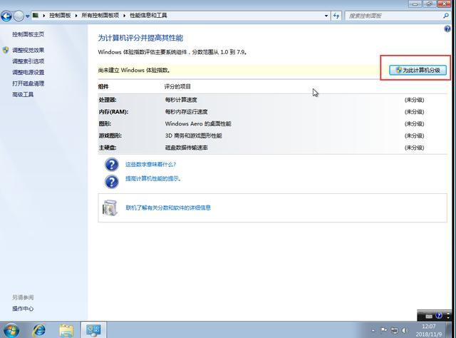 3、在“性能信息和工具”窗口中点击“为此计算机分级”,通过Windows体验指数来给电脑评分