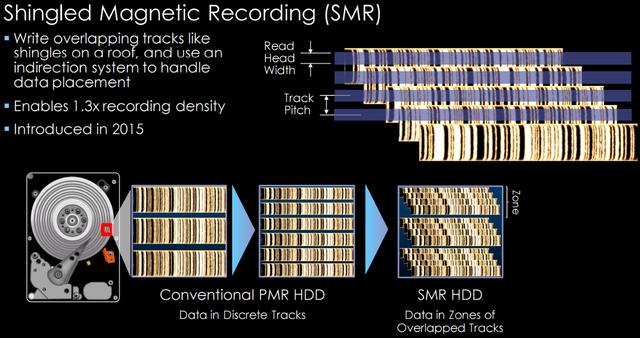 近日,西部数据推出了旗下新款企业级硬盘,Ultrastar DC HC550,单碟2TB,非叠瓦式(SMR)技术,使用的是EAMR技术,关于西部数据最新的EAMR技术的具体原理尚不得知,西部数据也只透露其为MAMR(微波辅助磁记录)技术的一个分支,虽然没有采用垂直式(PMR)技术,但是抛弃了叠瓦式(SMR)技术就已经让很多机友开心了,但是为什么叠瓦式(SMR)技术这么招人痛恨呢?