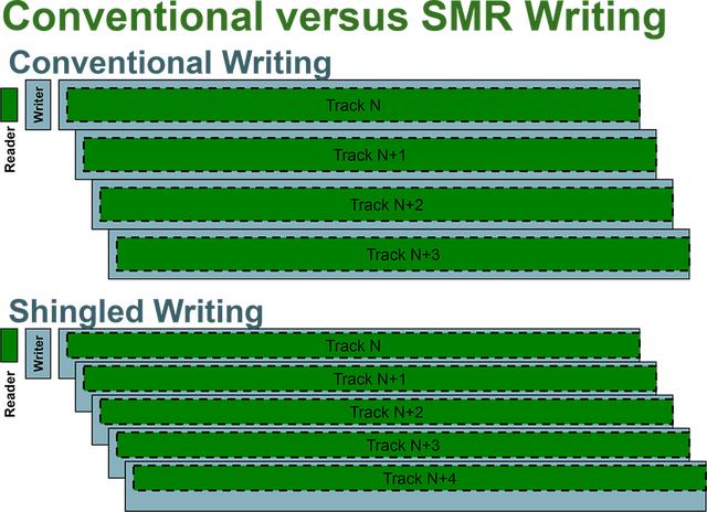 在叠瓦式硬盘第一次进行顺序写入的时候,是可以正常写入的,但是在需要改写其中一条磁道的数据时,就很麻烦了,以上图为例,如果要改写Track N的数据,叠瓦式硬盘需要先将会受到影响的Track N+1磁道的数据复制进缓存,然后磁头再对Track N的数据进行改写,改写完后,再将Track N+1的数据从缓存中复制回去。这也是叠瓦式硬盘的缓存普遍比垂直式硬盘大的原因。在任何设备中,每少一个步骤,出现错误的概率就会大大降低,所以叠瓦式硬盘的故障率也比垂直式硬盘高。